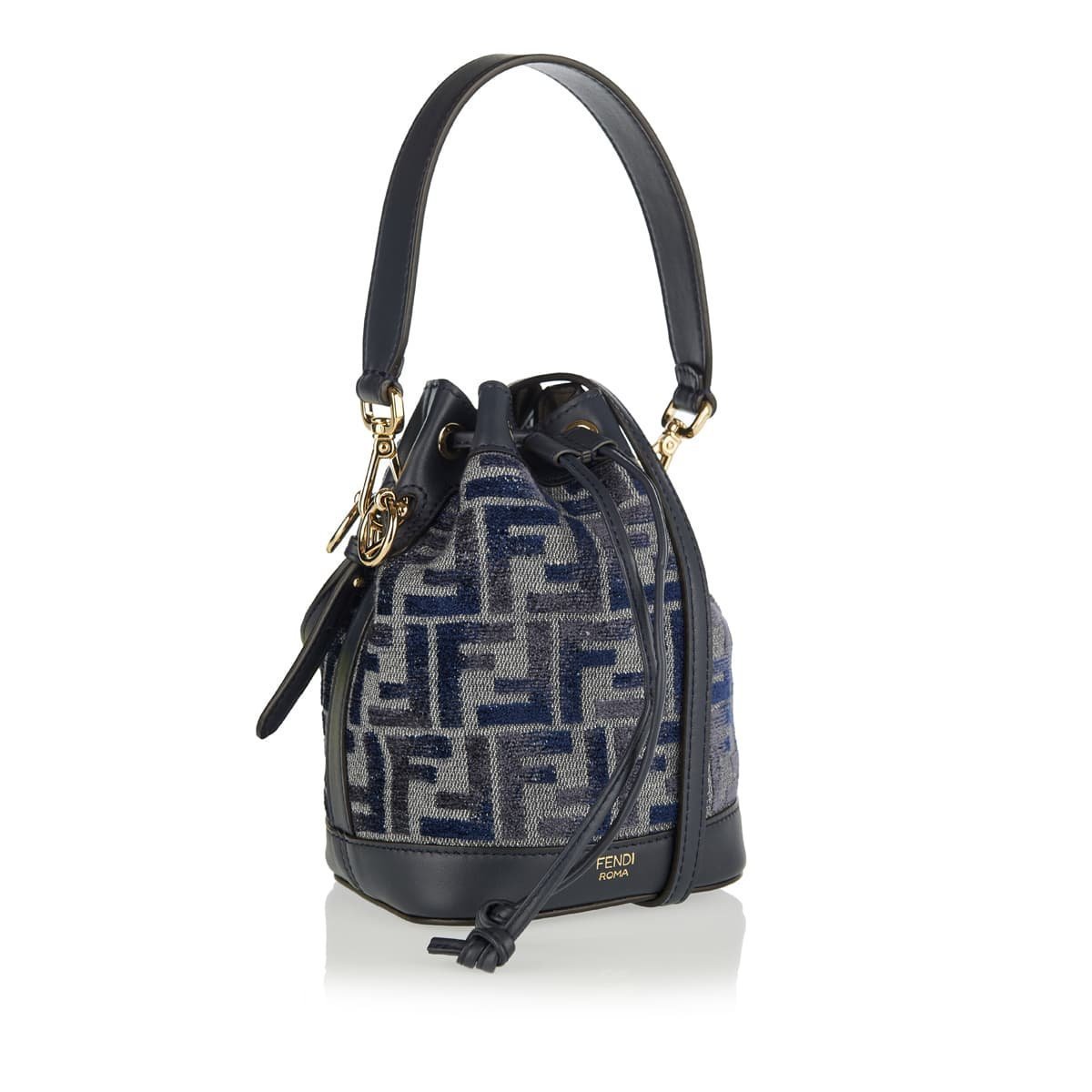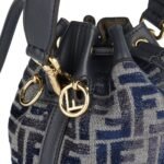 Αυτή η μπλε και γκρι τσάντα Mon Tresor είναι φτιαγμένη από ύφασμα σενίλ και είναι κεντημένη με το εικονίδιο FF της Fendi. Διακοσμημένο με δέρμα μαύρου τόνου, έχει διαμορφωθεί σε δομή μίνι κουβά που διαθέτει μία επάνω λαβή, κλείσιμο με κορδόνι περίσφιξης, μία θήκη και αφαιρούμενο λουρί. Είναι λεπτομερής με χρυσό μεταλλικό.