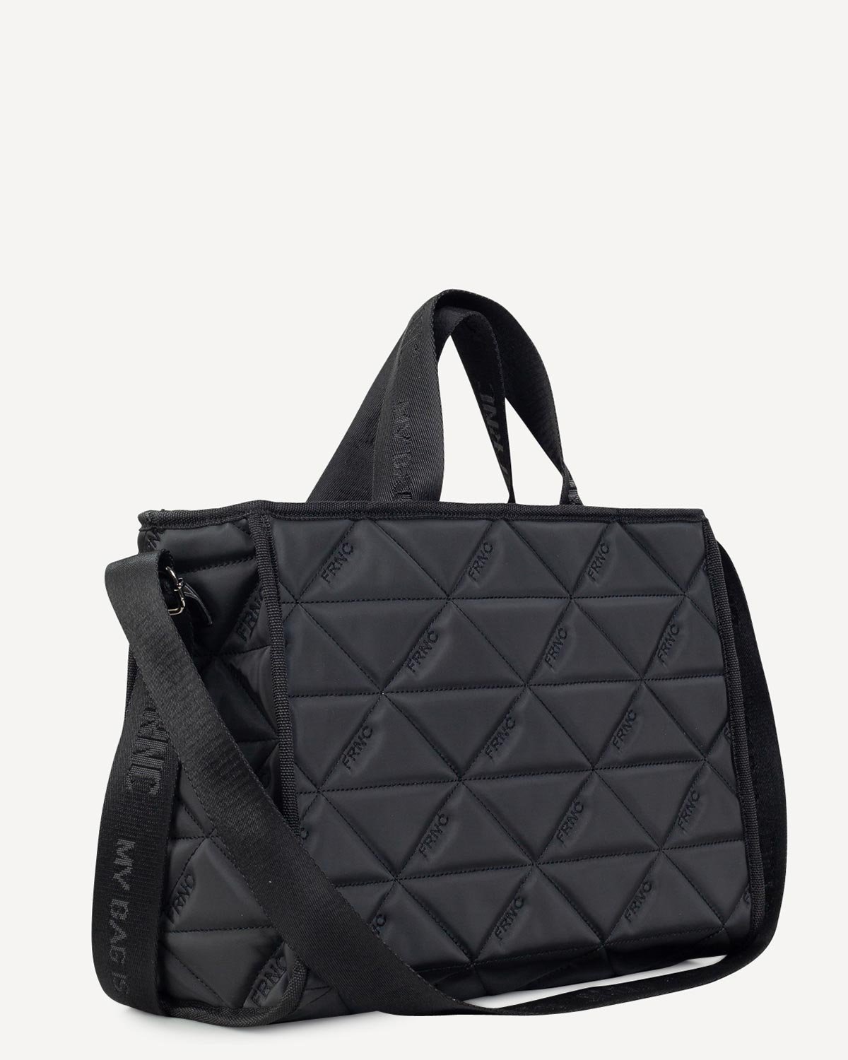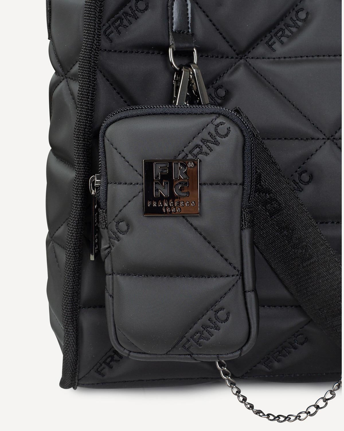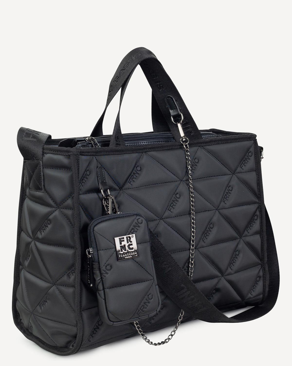 Γυναικεία τσάντα της εταιρείας FRNC κατασκευασμένη από δερματίνη σε μαύρο χρώμα με καπιτονέ σχέδιο. Ιδανική επιλογή για όλες τις ώρες της ημέρας, μπορεί να περαστεί στον ώμο, αλλά να κρατηθεί και στο χέρι. Το κύριο μέρος της τσάντας κλείνει με φερμουάρ, παρέχοντας ασφάλεια κατά τη μεταφορά των προσωπικών αντικειμένων. Διαθέτει αφαιρούμενο και ρυθμιζόμενο λουράκι.